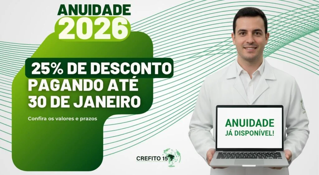 Os profissionais e empresas regularmente registrados no CREFITO-15 já podem realizar o pagamento da Anuidade 2026 e aproveitar descontos especiais para quitação antecipada, conforme os prazos estabelecidos.