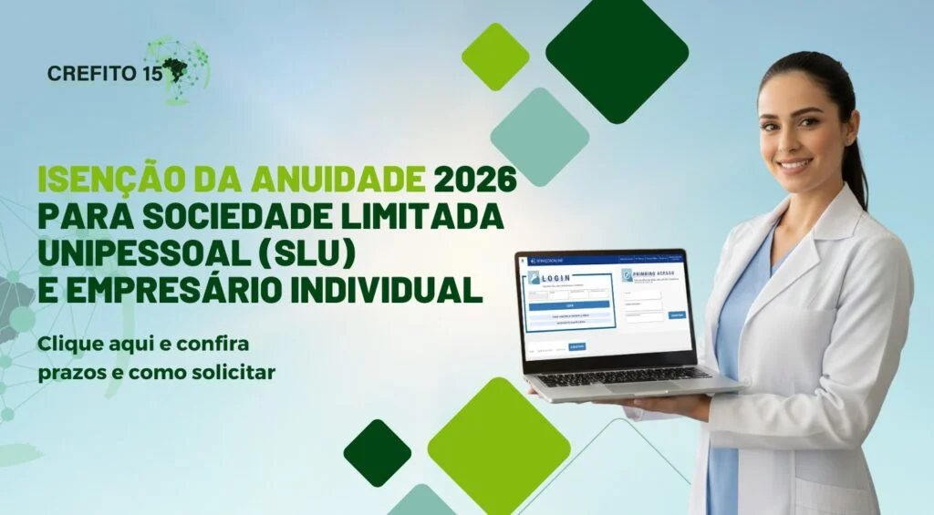 O Conselho Regional de Fisioterapia e Terapia Ocupacional da 15ª Região (CREFITO-15) informa que já está disponível a solicitação de isenção da anuidade 2026 de pessoa física para Fisioterapeutas e Terapeutas Ocupacionais que sejam sócios de Sociedade Limitada Unipessoal (SLU) ou Empresário Individual.