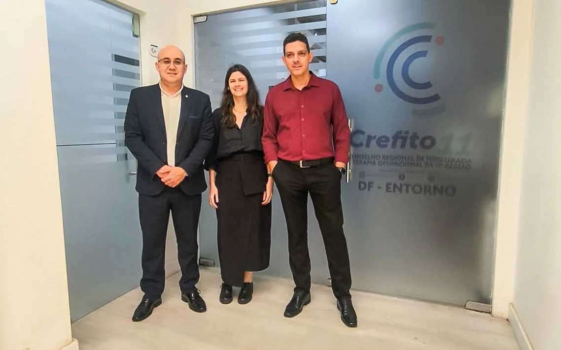 O presidente do Conselho Regional de Fisioterapia e Terapia Ocupacional da 15º região (CREFITO-15), Dr. Carlos Costa; a coordenadora do Departamento do Curso de Terapia Ocupacional da Universidade Federal do Espírito Santo (UFES), Profa. Giovanna Bardi; e o Dr. Silano Barros, diretor-tesoureiro do Conselho Federal de Fisioterapia e Terapia Ocupacional (COFFITO) e coordenador da Comissão de Assuntos Parlamentares (CAP), estiveram em Brasília para cumprir agenda institucional voltada ao fortalecimento da formação em Terapia Ocupacional no Estado do Espírito Santo.