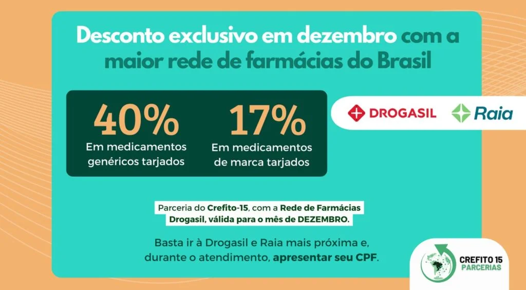 O fim de ano chegou com benefícios ainda maiores para os profissionais registrados no Conselho Regional de Fisioterapia e Terapia Ocupacional da 15ª Região (CREFITO-15). Até 31 de dezembro de 2025, quem é registrado no Conselho poderá aproveitar descontos exclusivos e ampliados na compra de medicamentos nas redes Drogasil e Raia.
