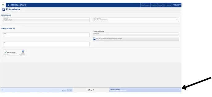 - Preencha com seus dados. Clique em “Não sou um robô”. Avance para próxima página em “DADOS PESSOAIS”.
